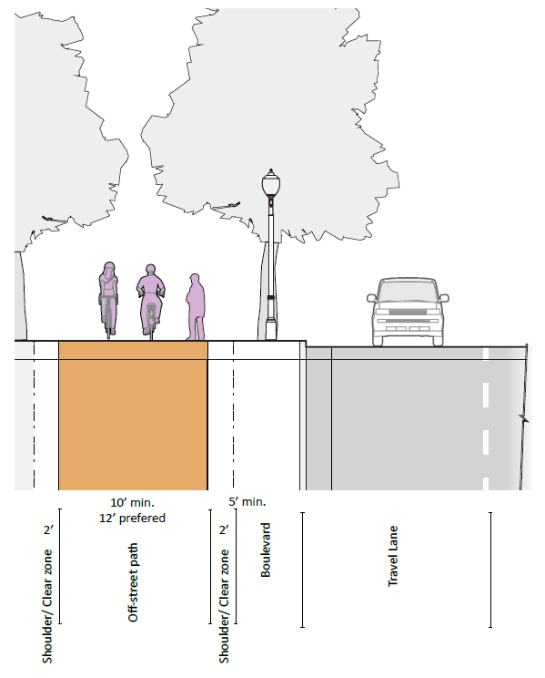 First: The bikeway is being narrowed, from 11 or 12 feet, down to 10 or even 8 feet in some sections. Between Wabash and Myrtle avenues, in particular — a well-used section — the bikeway is proposed to narrow from nearly 12 feet to 8 feet. According to the city’s own street design manual, 10 feet is the minimum for off-street bikeways (page 52), so the proposal for 8 feet is functionally obsolete and substandard, compromising cyclist safety without a convincing justification for the roughly 33% reduction in width.