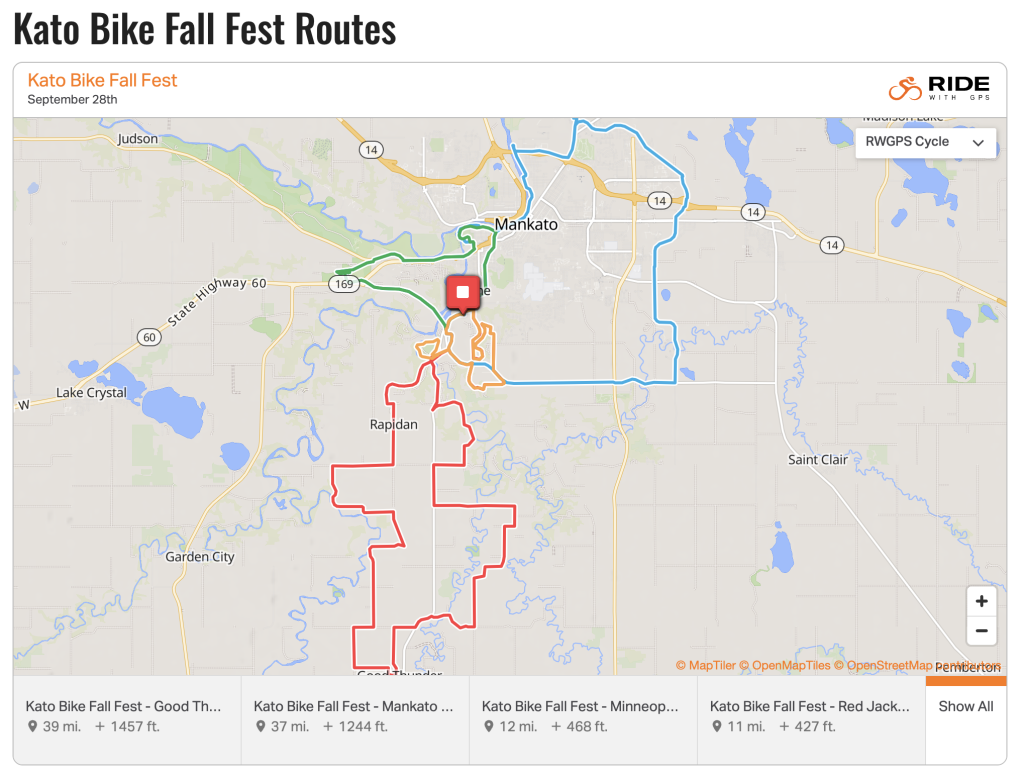 Those initiatives will benefit the Kato Bike Fall Fest in years to come, as Greater Mankato — already recognized as a Bicycle-Friendly Community by the League of American Bicyclists — enhances its reputation as a hub for bicycling. “We have all these communities within the Mankato biking community,” explains GMBWA secretary Becky (Davis) Brooks, a novelist and retired English professor. “We want to showcase the variety of biking options in the area.”