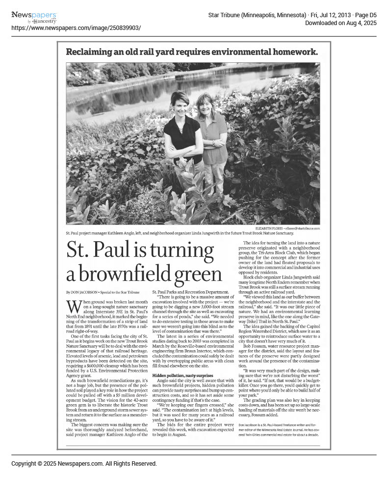 The Tri-Area Block Club successfully confronted several different developers and governmental agencies to thwart industrial redevelopment of the polluted former railroad land. Instead, the 42-acre parcel, previously known as the Trillium Site, was set aside as a nature sanctuary. Trout Brook sits on the eastern edge of the North End, near 35E, between Maryland Avenue on the north, Cayuga Street on the south and near Agate Street to the west. Over more than 20 years, the block club foiled a multitude of proposed industrial uses for the land, which included: