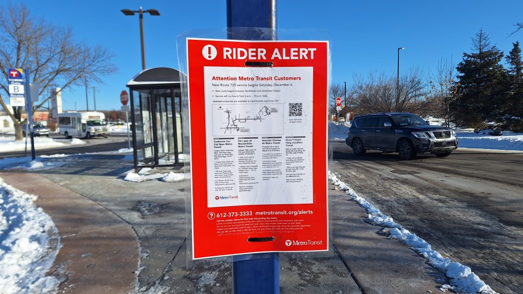 Did you ride Route 725 already? If so, Metro Transit is looking to hear from you to see what you think about this new bus route! The brief survey closes on April 1, 2026. Click me to send feedback.