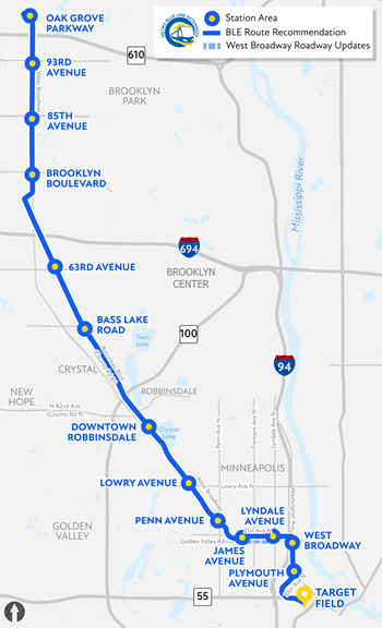 The Blue Line light rail extension project plans to add 13 new light rail stations along its 13.4-mile route that will primarily run in the median of West Broadway and Bottineau Boulevard (County Road 81) while serving the communities of North Minneapolis, Robbinsdale, Crystal and Brooklyn Park.