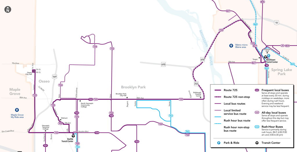 Route 725 also more conveniently serves Hennepin Technical College than the existing Route 721 originating from Brooklyn Center Transit Center — bridging the less than a mile transit gap between the technical college and Starlite Transit Center — while providing new services to downtown Osseo, an authentic main street-charm business corridor.
