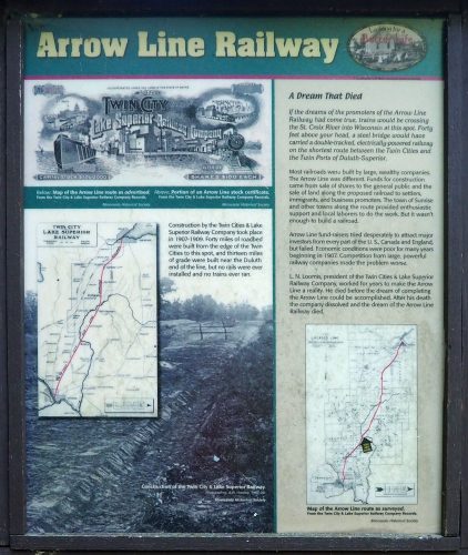 Inspired by LaDuke’s sensible words, I started researching electrically powered railways in Minnesota. A few weeks ago, I found a website describing the Arrow Line Railway marker sign on the Sunrise Loop trail in Wild River State Park, about an hour and 50 minutes south of Duluth. The marker sign tells visitors, “If the dreams of the promoters of the Arrow Line Railway had come true, trains would be crossing the St. Croix River into Wisconsin at this spot. Forty feet above your head, a steel bridge would have carried a double-tracked, electrically-powered railway on the shortest route between the Twin Cities and the Twin Ports of Duluth-Superior.”
