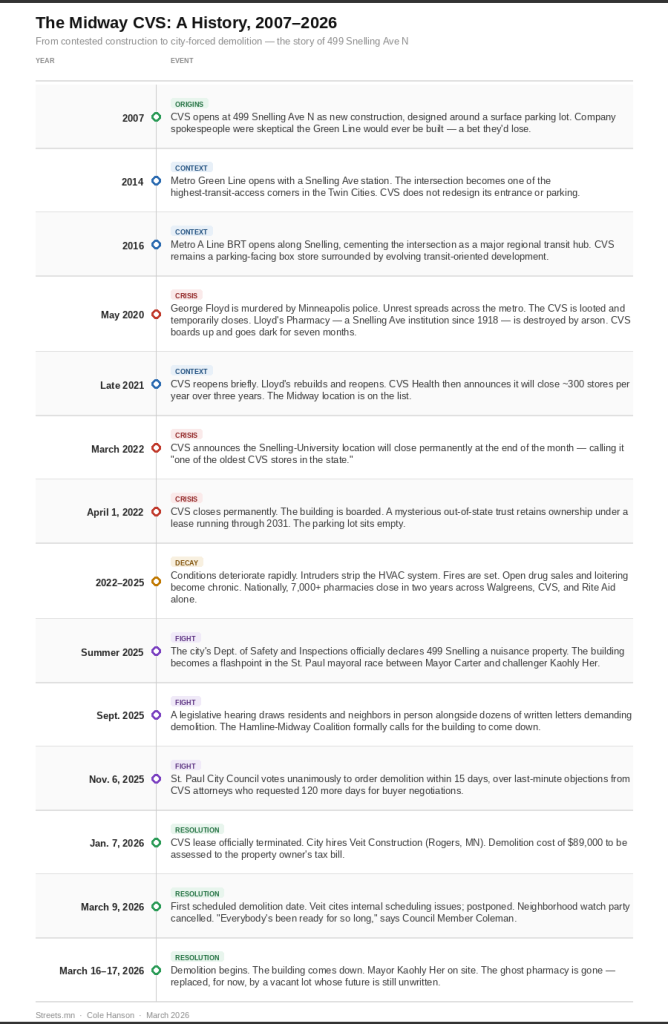 The Hamline-Midway Coalition earned this moment after years of effort, petitions, and townhalls. So did the neighbors who kept showing up to hearings, writing letters, and refusing to accept that an out-of-state trust and a Rhode Island-based pharmacy chain should get to define what the most important intersection in their neighborhood looks like. The city’s willingness to order and fund demolition over CVS’s legal objections was itself a statement: community pressure works, eventually.